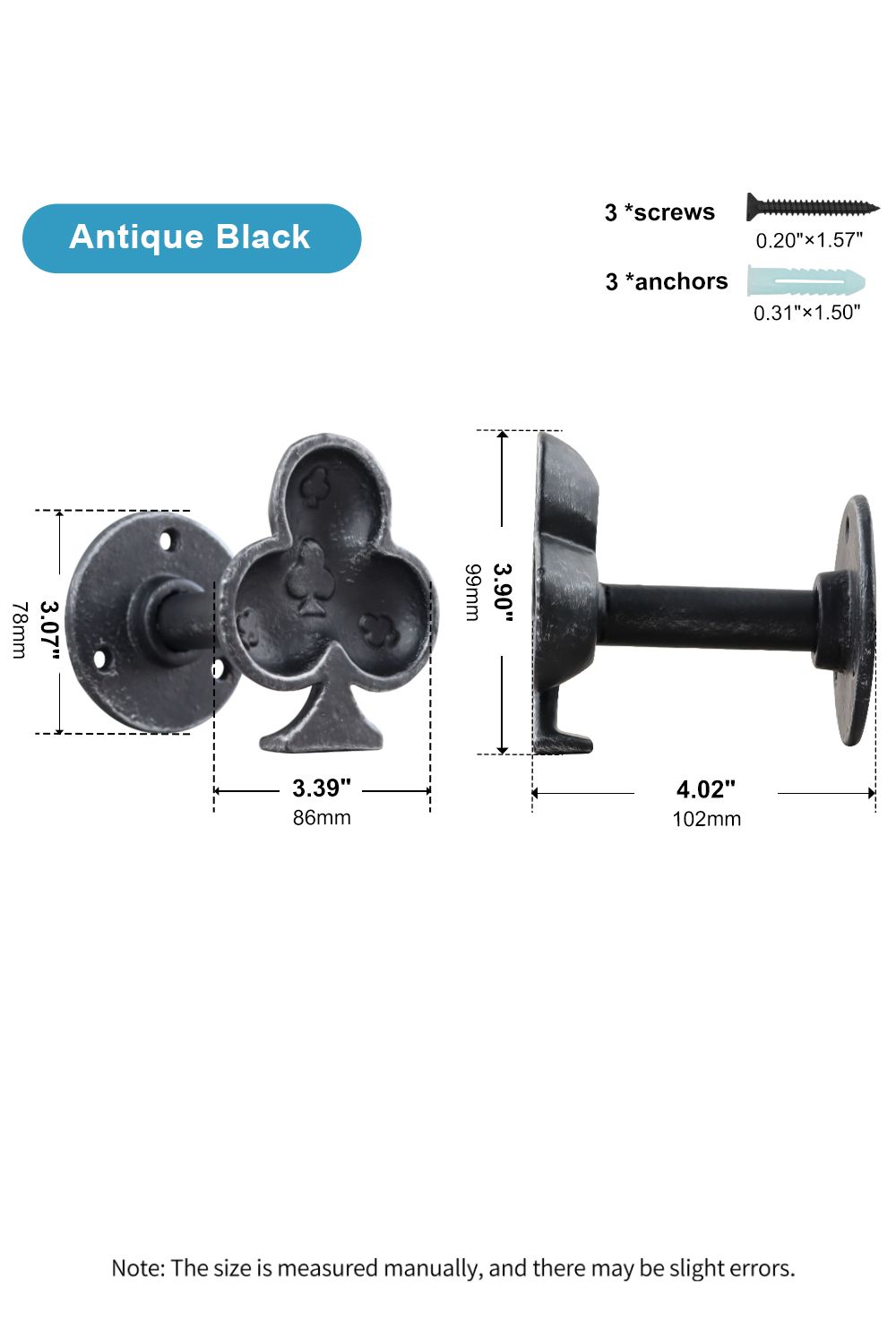 [Measurements] Clubs shape: 3.9"H x 3.39"W, Total length from wall: 4.02". Base diameter: 3.07". Weighs 1.1 lbs. Includes 3 screws & expansion anchors for easy installation.