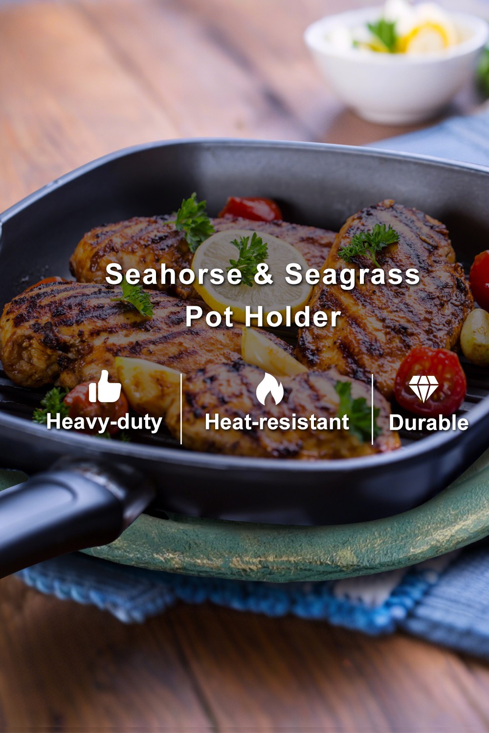 [Coastal Seahorse & Seagrass Design] Inspired by marine life, this handcrafted pot holder features a seahorse and seagrass motif, perfect for ocean lovers and those who are interested in nautical-themed décor.